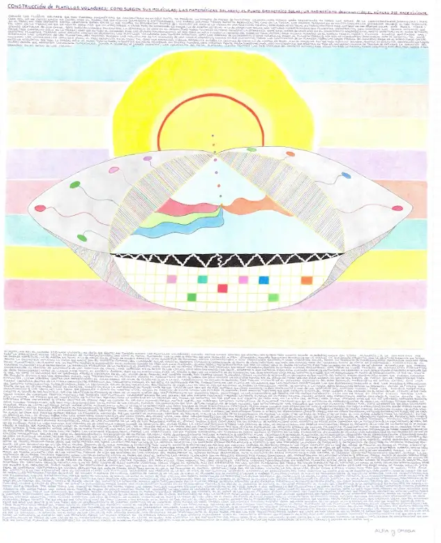 Sí hijito; así es; el número 318 nace viviente; es decir que siente; así también nacen los platillos voladores; cuando estas naves sienten que sienten, ven y oyen todo cuanto sucede alrededor; nacen con libre albedrío; y lo conservan por toda la eternidad; ellos ven su proceso de materialización; ven como el metal plateado las invade y sienten que van pasando a otra dimensión; sienten que nacen de nuevo; y que un pasado vá quedando atrás; tal como la criatura pensante que intuye un pasado espíritual; lo de arriba es igual a lo de abajo; en el dibujo se pueden apreciar ocho cuadritos de colores; estos corresponden a ocho vibraciones solares; a cada vibración solar, brota un torrente de moléculas; estos cuadros solares representan la geometría humana; la única que nació con el espíritu humano; del cuadrado solar nació el gérmen humano; y corresponde al punto de vista individual que cada ser humano, tiene del universo; punto de vista es imperfección; corresponde al polvo planetario; un planeta es un puntito perdido y suspendido en el espacio; cuando se crea una nave plateada, ocurre igual; por gigantesca que sea la nave; sólo el Padre es infinito; pues todo lo crea; en el dibujo se vé líneas amarillas que forman cuadros blancos; ello representa la inocencia filosófica de la materia y el espíritu; este color es un primer tiempo de una criatura que será voladora; durante su entrada a otras dimensiones, este tiempo se llama proceso de saturación magnética; corresponde al proceso de nacimiento de una criatura de carne; más conocida en el Reino de los Cielos, como reencarnación; es decir, regreso a una materia ó galaxia llamada carne; y es también un regreso a una determinada dimensión; a un punto donde debe reconocerse; antes de llegar a ese punto, el espíritu duerme; pero es un sueño-vida; pues vé, siente y oye; es un atributo de su inocencia; que dura mientras viaja por el infinito; y a medida que vá acercándose al punto de reconocimiento, lo que vé, siente y oye, es como un universo que vá quedando atrás; y comienza en él, el olvido de su pasado; así también ocurre con ciertas naves plateadas; tienen un olvido de su pasado; no recuerdan en que puntito del infinito fueron creadas; sólo saben que fueron creadas por mandato divino; y que los grandes soles, les proporcionan el alimento diario; el magnetismo solar; y saben que sólo exsiste un sólo Dios nomás; en el dibujo se puede ver una zona negra; en que se ven rayos de fuego solar; significa que toda evolución, lucha siempre contra una imperfección; el color negro es color de tinieblas; y es a la vez, magnetismo en estado de decisión; pues todo es viviente en el universo expansivo del Padre Jehova; el magnetismo en estas naves, son una fuerza creadora dentro de la misma creación; se diferencia del magnetismo humano, en que éste es gobernado por tal magnetismo; en los platillos voladores, son las criaturas espírituales las que gobiernan; pasando a ser los mundos y dimensiones del infinito inteligencias subordinadas; pues la frecuencia solar de sus moléculas, son producto de aquéllas; es como el hijo que reconoce al padre; la frecuencia menor, se somete a la mayor; esta revelación explica lo siguiente: desde el mismo instante en que el divino Padre inició su creación, surgió en ella la antiguidad; un mundo nace porque salió de una idea que es más antigua que dicho mundo; y la idea perteneció a una de las criaturas del antiguo mundo; pues los mundos materiales desaparecen y las ideas nó; las ideas que generáis a diario en vuestro vivir, viajan al espacio; de ellas nacen los futuros planetas; pues escrito fué: Hay que ser chiquitito y humilde, para llegar a ser grande en el Reino de los Cielos; ¿qué más chiquitito al grado de ser invisible, que una idea? ¿que se piensa y se crea en la mente y no se deja ver? ciertamente que vuestras ideas, constituyen lo más microscópico que poseéis; es por eso que fué escrito: Cada uno se hace su propio cielo; porque las ideas nacen de vuestras propias mentes; así también los platillos voladores nacen de los soles; que son fuegos mentales mayores; la mente humana es un fuego mental menor; ambas son fuego; tanto arriba como abajo; y hacia donde se dirija la mente, es fuego; que se manifiesta en infinitas formas; pues la variedad en la creación del Padre, es infinita; es por eso que fué escrito: De todo hay en la viña del Señor; esta divina variedad hace que en el universo expansivo pensante, exsistan otros universos y otros dentro de otros; aquí no cuenta el cálculo humano; porque antes que él, ya hubieron infinitas matemáticas de planetas tierras; que ya no están en el espacio; y antes de aquello, hubieron futuros mundos; no sólo mundos terrenales; que son casi desconocidos en el Reino de los Cielos; mundos colosales; en que una de las moléculas de esos mundos, son infinitamente más grandes que vuestro planeta Tierra; más, esto no significa que esos colosales mundos, sean el límite; no; porque jamás habrá límite alguno; no lo hubo, ni lo hay ni lo habrá; pues las ideas salidas de esas gigantescas criaturas, crean otros mundos más gigantescos aún; y así remontáos por toda la eternidad; hasta donde vuestra mente pueda imaginar; estos mundos pertenecen al macrocosmo; y vuestra Tierra al microcosmo; Macro es mayor y Micro menor; es por eso que mi divino Hijo Solar Cristo os dijo: De donde yo soy, ustedes ni pueden ir; aludía a estos colosales mundos; de allí él vino a visitaros; vino en realidad, a un mundo infierno; donde monitos de carne, se odiaban unos a otros; se esclavizaban unos a otros; se explotaban unos a otros; se engañaban unos a otros; era en otras palabras, un mundo-infierno; un mundo que se creaba y aún se crea sus propios yugos; porque la filosofía escogida por los espíritus humanos, contiene el bién y el mal; y la razón de su exsistencia es probar la vida; ó se vá para el bién, ó se vá par