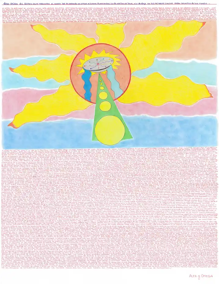 Sí hijito; es así; tal como tú lo ves en tu television mental; este diBujo celeste enseña que del sol Alfa, salieron y aún salen divinas chispitas solares, de las que serán futuros mundos; todo planeta fué chispita solar; una microscópica chispita; escrito está, Que hay que ser chiquitito y humilde, para ser grande en el Reino de los Cielos; esta divina ley, se cumple en cualquier punto del universo expansivo pensante; todos; criaturas y mundos son primero microscópicos; para luego expandirse en crecimiento y ser grande en el espacio; toda grandeza, desaparece a su vez, ante la grandeza del Padre; él es de eternidades antes, que toda grandeza; y es igualmente de antes, de lo más microscópico, que mente alguna pueda imaginar; Él es, ha sido y será siempre el primero; en todo el universo se le conoce; sus nombres divinos son infinitos; según las infinitas evoluciones que exsisten; para un mundo, se llama tal nombre; ó tales nombres; para otro mundo, igual; no exsiste punto del universo, que no se pronuncie con devoción, su divino nombre; es por eso, que el divino Padre se hace llamar a sus hijos de todo el universo, Soy el que Soy; pues para unos soy el Señor, para otros Jehova y para otros, dios; Alá o el Creador; el gran arquitecto; eterno Padre; etc.etc.; muchos nombres y un sólo dios nomás; pues en todas partes estoy; siendo mi poder divino infinito, doy vida a lo que se cree muerto; mi universo es viviente; y las llamadas muertes de las criaturas, es sólo una transformación para el espíritu, que dejando su envoltura de carne, regresa al mismo lugar de donde salió; al mismo lugar donde tomó un cuerpo de carne; es por eso que se dice: débil es la carne; pues sólo dura, mientras el espíritu vive momentáneamente en un planeta material, al tomar un cuerpo de carne, todo espíritu se reduce en dimensión; ¿acaso una criatura que sale del vientre de una madre, no empezó en forma microscópica su desarrollo? es así, que casi todas las madres no se dan cuenta, a ciencia cierta, si están embarazadas ó nó, de tan microscópica es la criatura; la criatura estando dentro del vientre de una madre, se expande en desarrollo; en igual forma como se expandió la microscópica chispita solar, de la que nació la Tierra; los dos procedimientos son iguales en sus primeras causas y muy distintos, en sus liBres alBedríos; siendo lo de arriba igual a lo de abajo, en su principio microscópico; no son iguales en sus propias evoluciones; cuando se vuelve al puntito de donde se salió, allí se reconocen materia y espíritu; pues el mandato ordenado, ya se cumplió, exsiste por lo tanto, un divino punto de reunión en el infinito; pues si así no fuera, todo espíritu se perdería en el infinito; no teniendo un hogar; que equivale a no tener un destino; y eso sería, el más espantoso de los castigos; la Ciencia Celeste cuyo divino símbolo es el Cordero de dios, es la única que explica para todos, que es lo que sucedió, para que la Tierra y sus moradores, nacieran y se desarrollaran en un planeta microscópico; pues la Tierra tiene sus límites y su peso; el infinito carece de ellos; pues el universo jamás ha tenido límites alguno; ni lo tendrá jamás; cuando un planeta ó espíritu nace en alguna lumbrera solar, nace ignorando que nace; igual cuando nace Bebé en los planetas; el universo se le aparece en todo su esplendor; sólo siente atracción magnética hacia su divina Madre Solar Omega; que se expande en todos los soles del universo; en toda infinita jerarquía solar; pues la Santísima Trinidad Solar está en todas partes; está en mundos de carne, tan microscópicos como la Tierra misma; como está igual en mundos tan colosales, que por su tamaño mismo, jamás serán conocidos por los seres humanos, aquí no hay prohiBición alguna; sólo exsisten destinos y eternidades; y cada cual; sean criaturas ó planetas, tienen que cumplirlo, jamás se ha dado el caso, que alguien haya desobedecido, a su propio destino; todos los mundos poseen antiguidad galáctica; en el Reino de los Cielos, todas las divinas criaturas, saben esto; los terrenales aún no lo saben; pero llegó la hora que lo sepan; todo conocimiento llega, cuando debe de llegar; y al llegar un determinado conocimiento, la ciencia de un mundo, se vé sacudida; lo que se creía único, no lo es; pues toda realidad, no es estable; es infinitamente cambiable, nada es permanente en el desarrollo universal; todo se mueve; tanto lo de arriba como lo de abajo; y todo se moverá por siempre jamás; en el diBujo celeste se pueden ver ciertos colores; saliendo de una nave plateada; esos colores que son infinitos en número, representan las virtudes de la Madre Solar Omega; y esta divina revelación, explica de que cada espíritu nace con diferentes características con respecto a los otros; este fenómeno, se conoce en la Tierra, como individualidad; las cuales, jamás se han repetido entre las criaturas; aunque aquí, no es correcto hablar de individualidades; pues eso pertenece al mundo; pertenece a la materia; y corresponde a un espíritu, que ha pedido nacer de nuevo; para probar una determinada forma de vida; escrito está: Todo espíritu es probado; probado en su propia determinación; en la filosofía que escogió, siendo un espíritu solar; allá, en el Reino de los Cielos; esta divina revelación explica lo siguiente: Todos nacen sin excepción alguna, en estado de inocencia espíritual; nadie nace con individualidad alguna, estando en estado de inocencia; posee sí, su futuro gérmen; este gérmen de la individualidad, sólo empieza a madurar, cuando el espíritu pide una determinada vida en algún planeta del universo; muchos dicen, que se nace con la individualidad; y esto, también es cierto; y demuestra que el espíritu, ya ha vivido en otros mundos; puesto que ya trae una individualidad; si no la trajera, sería considerada, como la criatura más misteriosa, que haya pisado el planeta; pues allí 