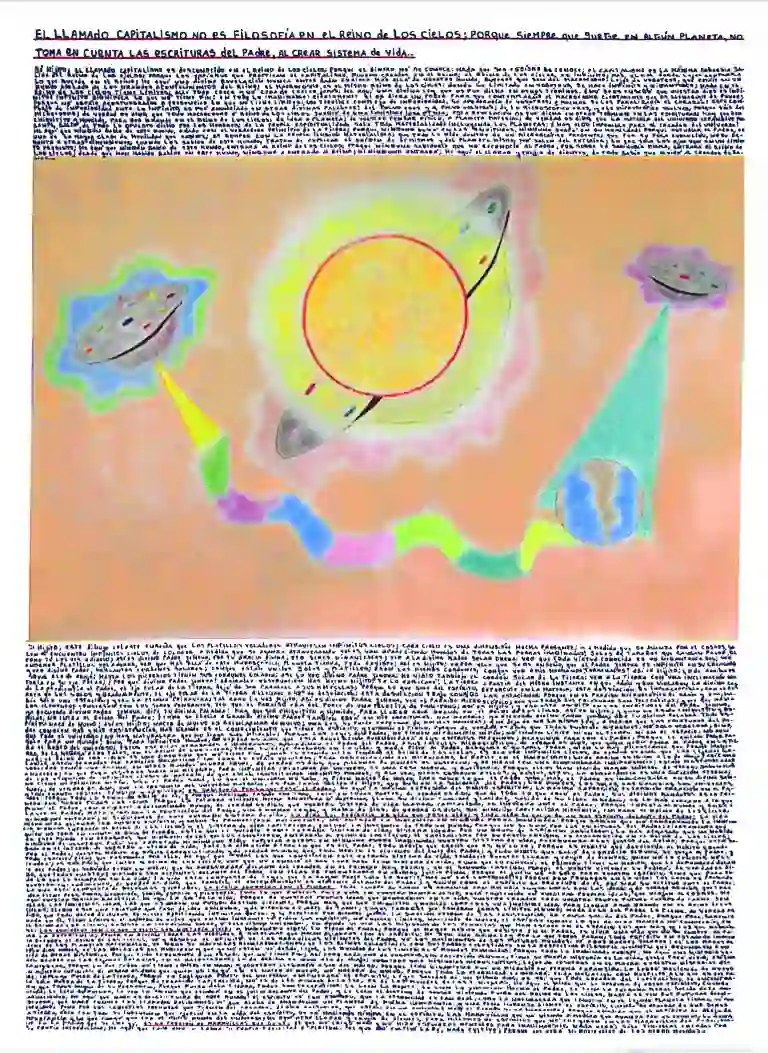 Sí hijito; este dibujo celeste enseña que los platillos voladores atraviesan infinitos cielos; cada cielo es una dimensión hecha presente; y a medida que se avanza por el cosmos, salen al encuentro infinito cielos de colores; a medida que se avanza atravesando soles, van apareciendo mundos de todas las formas imaginadas; soles de tamaños que causan pavor; tal como tú los ves a diario; así es divino Padre Jehova, por tu gracia divina, veo seres gigantescos; veo a la divina Madre Solar Omega; veo que toda virtud conocida es un gigantesco sol; veo enormes platillos voladores; veo que más allá de este microscópico planeta Tierra, todo exsiste; así es hijito; es por ello que se os enseñó, que el Padre Jehova es infinito en su creación; y veo divino Padre, brillantes cordones solares; conque están unidos soles y platillos; ¿son los mismos cordones, conque veo a mis hermanos terrenales? así es hijito; lo de arriba es igual a lo de abajo; hasta los microbios tienen sus cordones solares; así lo veo divino Padre Jehova; he visto también el cordón solar de la Tierra; veo a la Tierra con una inclinación notoria en su eje solar; ¿por qué divino Padre Jehova? admirable observación has hecho hijito; te lo explicaré: la Tierra a partir del mismo instante en que Adán y Eva violaron la divina ley de la obediencia al Padre, el eje polar de la Tierra, dejó de ser paralelo a sus moléculas; porque lo que sale del espíritu, repercute en la materia; esta desviación es imperceptible; con el correr de los siglos, y gradualmente, el eje polar de la Tierra a llegado a 42o de desviación; esta desviación trajo consigo las estaciones; porque en el paraíso microscópico de Adán y Eva, había sólo una estación; y era la eterna primavera; tal como la ves hijito; así es divino Padre Jehova; veo el Paraíso microscópico; veo que todas sus criaturas son telepáticas; y veo que hasta los elementos conversan con los seres pensantes; veo que el paraíso era del porte de una pelotita de ping-ping; así es hijito; y eso está escrito en las escrituras del Padre Jehova; ya recuerdo divino PadreJehova; dice tu divina palabra: hay que ser chiquitito y humilde, para llegar a ser grande en el Reino de los Cielos; así es hijito; y quien no ha sido chiquitito y humilde, no entra al reino del Padre; ¿cómo se llega a grande divino Padre? también está en mis escrituras; haz memoria; ya recuerdo divino Padre Jehova; dice tu divina palabra: todo espíritu nace de neuvo; así es hijito; nacer de nuevo es reencarnar de nuevo; una ley se puede expresar de muchas maneras; y nó deja de ser la misma ley; a medida que las criaturas del Padre conocen más y más existencias, más grande es el conocimiento que tiene el espíritu; y también el físico; porque de verdad os digo, que todos fuísteis microbios; nó solo vosotros; sino, que todo el universo; na hay naturaleza que no haya sido microbio; porque las leyes del Padre, nó tienen ni principio ni fín; nó tienen límite ni en el tiempo ni en el espacio; no son sólo para un mundo; sino, para infinitos mundos; de verdad os digo, que esta Revelación avergonzará a los espíritus mezquinos; mezquinos para con el Padre; porque le quitan poder para el resto del universo; estos espíritus atrasados e ignorantes, subordinan el poder del Padre, a sus cálculos microscópicos; de verdad os digo, que quien negó poder al Padre en la Tierra, se le negará a los tales, en el Reino de los Cielos; todos fuísteis probados en la vida; y nadie pidió al Padre, rebajarle ó quitarle poder; ni en lo más microscópico que podáis imaginar; el Reino de los Cielos es una dimensión que nó tiene fín; jamás lo a tenido ni lo tendrá; el Reino de los Cielos, es a la vez infinitoscielos; de verdad os digo, que las lejanas galaxias, están formadas por familias galácticas; tal como lo estáis vosotros; toda organización del microcosmo, se repite en el macrocosmo; lo de arriba es igual a lo de abajo; así como vosotros tenéis una rutina, en otros mundos ocurre igual; de verdad os digo, que millones de mundos os observan; y os miran con una acostumbrada indiferencia; están acostumbrados a hacerlo; lo que para vosotros sería un milagro, para infinitas criaturas del universo, es una cosa normal y rutinaria; porque ellos han nacido mayor número de veces; saben más de las escencias de infinitas clases de materia, de que están constituídos infinitos mundos; y a la vez, otros observan a ellos; y a éstos, otros; la observancia es una suceción eterna; nó tiene ni principio ni fín; sólo el Padre sabe, lo que el universo no sabe; y piden nacer de nuevo, para saber lo que el Padre sabe; más, el Padre es inalcanzable en su divina sabiduría; de verdad os digo, que la presencia del universo material, es por causa salida de hijos, que buscan la sabiduría del Padre; los mundos, los soles, las galaxias, los universos, y todo cuanto exsiste, exsistió y exsistirá, es sabiduría por la que pasó el Padre; he aquí la máxima expresión del mérito espíritual; la máxima expresión, es también creación en el Padre; porque todo lo conocido salió de él; y porque habiendo pasado por todo, está en todas partes; de verdad os digo, que de todo lo que creó el Padre, sus divinos mandatos es lo primero por sobre todas las cosas; porque la palabra viviente hecha escritura ó doctrina, lleva su divina cualidad y calidad, salida de su libre albedrío; es lo más cercano a lo que pensó el Padre, con respecto a determinado mundo; de verdad os digo, que vuestro sistema de vida llamado capitalismo, es hipócrita ante el Padre; porque explota al mundo y ruega a la vez al Padre; mata é implora la protección del Padre; viola muchas leyes, y habla de Dios; de verdad os digo, que ningún capitalista hipócrita, entrará al Reino de los Cielos; ni ninguno entrará; ni seguidores de este extraño sistema de vida; la vida que pedísteis, es vida que posee vida; y toda vida se queja de un 