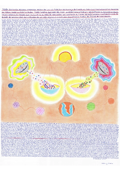 Sí Hijito; este dibujo celeste es el mismo que vienes viendo desde niño; su significado es infinito; aquí se ven las ideas generadas por las mentes humanas; toda idea nace en geometría líneal alfa, y termina en circular omega; toda idea es de colores; los platillos voladores circundan los planetas del cosmos, para recoger las ideas de sus criaturas; toda idea a partir de los doce años de edad, es seleccionada por los Padres Solares de los platillos voladores; las ideas con influencia de tinieblas, son sacadas del conjunto; porque nada extraño debe quedar en los espacios de la luz; y entre las ideas de tinieblas, están las ideas de los escándalosos del amor; ninguna llamada pareja del extraño mundo salido del cálculo al oro, ninguna volverá a entrar al Reino de los Cielos; es más fácil que entre al Reino de los Cielos, uno que no conoció el amor, pero que no escandalizó; a que pueda entrar uno que habiendo conocido el amor, cayó en escándalo; el amor jamás debió de haberse exhibido, en las calles del mundo; porque al Padre exhibieron; el extraño amor nacido entre los que pidieron conocer una forma de vida, poseyó una extraña psicología; este extraño amor, no tenía el sello divino del Padre Jehova; porque ninguno de sus extraños protagonistas, se sabían de memoria el divino evangelio del Padre; todos pidieron cumplir con lo de dios, por sobre todas las cosas, en la prueba de la vida, el término: por sobre todas las cosas, fué promesa salida del libre albedrío espíritual de cada uno; este término incluye todo lo imaginable; incluye el propio amor de extraña psicología; el extraño concepto del amor que tuvieron las criaturas humanas, durante la prueba de la vida, se debió al extraño mundo interesado, que les tocó vivir; el vencer esta extraña influencia, consistía la prueba de la vida; unos más, otros menos; la individualidad de cada uno, tuvo que enfrentarse a una extraña forma de vida egoísta; nadie de este extraño mundo, pensó en el infinito, durante el desarrollo del magnetismo llamado amor; nadie vinculó la eternidad con esta sensación; fué un extraño amor desarticulado; fué extraño producto de una extraña forma de vida, desconocida en el Reino de los Cielos; de verdad os digo, que esta clase de amor, no entra al Reino; ninguna llamada pareja humana, a vuelto a entrar al Reino de los Cielos; desde que el mundo es mundo; ninguna entrará; toda la generación tendrá su llorar y crujir de dientes; porque a todos influyó el extraño capitalismo; si del llamado capitalismo surgió el vicio, el escándalo y toda forma de inmoralidad, es que el capitalismo es el culpable de que ninguno que conoció el amor, durante su reinado vuelva a entrar de nuevo, al Reino de los Cielos; de verdad os digo, que en medio de un llorar y crujir de dientes, todas las llamadas parejas humanas y matrimonios, se separarán; porque el estar unido violando en todo instante, la divina ley del Padre, hace que la extraña pareja ó extraño matrimonio, se alejen más y más, del Reino de los Cielos; este alejamiento se viene efectuando desde el mismo instante en que las llamadas parejas se conocieron; y aún continúa segundo por segundo hasta el instante mismo de la separación; y todo hijo producto de estas uniones, recibe en su propia carne, una extraña herencia que le impedirá el volver a entrar al Reino de los Cielos; es por esto que fué escrito: padres maldecirán a sus padres; hijo maldecirán a padre y madre; y toda madre al fruto de sus entrañas; porque toda herencia es tan expansiva, como el universo mismo; lo de arriba es igual a lo de abajo; la más miníma sensación, se vuelve universo que no cesará jamás de expandirse; he aquí el llorar y crujir de dientes, de todo el que procreó en su extraño y desconocido sistema de vida; si el extraño sistema de vida, salido de las extrañas leyes del oro, no está escrito en el Reino de los Cielos, sus actores ó protagonistas, tampoco lo están; pasan a ser desconocidos; se cierrán los cielos; he aquí la paga que recibe, el haber vivido una extraña forma de vida, que incluyó el extraño libertinaje; empezando por el libertinaje, de escoger formas de vida, sin tomar en cuenta, al divino Padre; de verdad os digo, que si al Padre hubiéseis tomado en cuenta, este mundo no sería regido por los inmorales, que se aferraron al oro; no serían los acomplejados al oro, los que os mandarían; serían los humildes los que se gobernarían ellos mismos; y de verdad os digo, que solo ellos quedarán en este planeta; porque todo árbol que nó plantó el divino Padre de raíz será arrancado; y uno de los árboles mayores, es el llamado capitalismo ó gran bestia; la bestia es el tronco y sus seguidores las ramas; esto significa que la extraña bestia, proviene de otros mundos de las tinieblas; es por esto que la bestia es inteligente y astuta; posee ciencia para dominar; más, toda ciencia como toda vida, tiene su tiempo; tiene su reinado y su fín; a la bestia la sorprendió el fín del tiempo; su estrella se apaga; y la bestia agoniza; su agonía nada tiene de humildad; porque de los interesados, no sale la verdadera humildad; la verdadera humildad, sale del sufrido y del pobre; en su caída la bestia, todo quiere destruírlo; porque herida en su orgullo; la extraña bestia jamás aceptará hacer un papel secundario en los acontecimientos del mundo; la bestia sólo conoce la extraña moral, salida de la posesión del oro; y mientras más oro tuvo la bestia, mas extraña fué su moral; tan extraña fué, que se convirtió en inmoralidad; la bestia se encontrará con el Hijo Primogénito; y por primera vez, la extraña bestia no podrá matar a su enemigo; como era su extraña costumbre; los últimos miembros de la bestia, los que no se suicidaron, caerán bajo el terrible fuego extinguidor, del hijo de dios; he aquí que la bestia, fué un extraño producto, de un grupo de ambiciosos acomplejados a la primera i