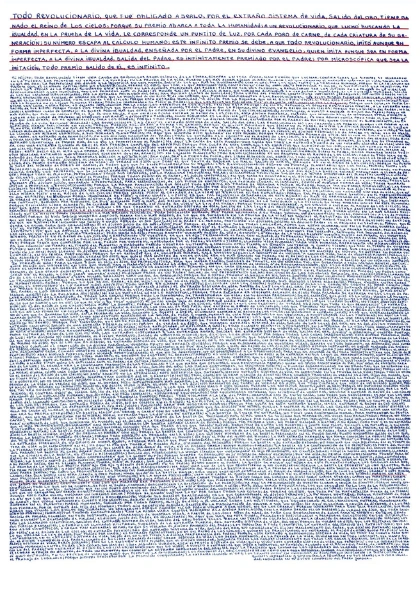 Sí Hijito; toda revolución tiene una causa de orígen; las revoluciones de la Tierra, siempre en toda época, han tenido que luchar, contra seres que siempre se aferraron en la fuerza; los primeros en emplear la fuerza, en la prueba de la vida, fueron los más acomplejados al oro; fueron los que crearon el extraño sistema de vida, salido de las leyes del oro; la perpetuidad del dolor y la injusticia en este mundo, salió de los que más se ilusionaron con el oro; por los ojos, entró la tragedia humana; porque si la criatura no tuviese ojos, el llamado capitalismo no exsistiría; de verdad os digo, que todo el que ambicionó oro, contribuyó con su ambición, a perpetuar el dolor, el sufrimiento y la injusticia, en todas las épocas de la Tierra; su número está inscrito en las divinas escrituras del Padre; pidieron ser los elegidos, y resultaron ser los últimos en la prueba de la vida; los revolucionarios y los humildes, son los primeros ante el Padre; el mundo salido del cálculo al oro, no supieron distinguir la verdadera humildad, de la extraña humildad, salida de los que estaban influenciados, por la extraña psicología del oro; hay muchas clases de humildad; toda virtud del espíritu, constituye infinitas jerarquías; infinitos grados en la propia sensación del pensar; de verdad os digo, que la humildad de un rico ó de un cómodo, que fueron indiferentes a las revoluciones, que ellos mismos pidieron conocer, como experiencia, no es la primera humildad, en el Reino de los Cielos; porque esta extraña humildad, se divide por la riqueza, que ni el rico pidió vivirla; todo rico pidió saber en conocimiento, que era la riqueza en el lejano planeta Tierra; todo lo imaginable se pidió al Padre; lo que los ricos no pidieron, fué el de dejarse influenciar por la riqueza; porque una cosa, es pedir conocer una cosa, y otra cosa, es dejarse influenciar por la cosa; los espíritus de los ricos, tenían esta prueba; de ellos, dependía el oponer resistencia mental, a la extraña sensación, de ser ricos; porque todos los espíritus que han pasado por este mundo, todos sabían que la riqueza, no exsiste en el Reino de los Cielos; porque en la gloria del Padre, no se conoce ninguna clase de complejo; el querer poseer más que otro, se considera un complejo en el Reino de los Cielos; ningún acomplejado, a vuelto a entrar al Reino del Padre; porque es más fácil, que pase un camello por el ojo de una aguja, a que un rico entre al Reino de los Cielos; esta divina parábola, enseña que ningún rico, de ninguna época, a vuelto a entrar a su lugar de orígen; ni ninguno entrará; y demuestra también, cuan rigurosa es la divina justicia; esta divina parábola, es una advertencia para todo el que poseyó; más que los demás; no es advertencia, para los pobres; porque todo pobre, respetó la divina igualdad, enseñada por el Padre; de hecho, quien conoció el sufrimiento, en la prueba de la vida, reclamó igualdad; las revoluciones las creó el extraño sistema de vida, salido del oro; las revoluciones no las crearon los pobres; aunque los pobres y los sufridos, hayan participado en ellas; porque fueron obligados a tomar tal camino; porque el divino mandato que pidieron al Padre, de vivir la divina igualdad, en el lejano planeta, está escrito en sus destinos; todo espíritu que pidió venir a la Tierra, trae en sí mismo, el sello de la igualdad del Padre; exsiste en los espíritus, en virtud de sus libres albedríos, la tendencia natural, de imitar en lejanos mundos, la misma igualdad que vieron en el Reino de los Cielos; el divino término: Lo de arriba es igual a lo de abajo, lo llevan los mismos espíritus, a sus moradas planetarias; he aquí que ningún rico quedará en este mundo; porque tan extraña forma de vivir, no lleva el sello de la eternidad del Padre; es extraño y desconocido, en los divinos mandatos del Padre; todo lo extraño a lo escrito en el Reino de los Cielos, es efímero y vuelve al polvo del olvido; todo rico y toda nación rica, salida del extraño y desconocido sistema de vida del oro, quedarán en la más grande pobreza; he aquí el llorar y crujir de dientes, de los que se tomaron el extraño libertinaje de poseer más, de lo que le prometieron al Padre; he aquí la caída de este mundo; una caída que tomó la extraña forma, de un extraño sistema de vida; una caída, con una extraña ilusión al oro; el más terrible complejo del espíritu; porque por culpa de este complejo, los espíritus que sufrieron su influencia, no entran al Reino de los Cielos; porque lo prometido al Padre, se dividió; nada dividido vuelve a entrar al Reino de los Cielos; he aquí la invisibilidad, es el sello de todo pedido de vida, hecho al Padre; este sello es el alfa y la omega, de todas las formas de vidas del universo; porque nadie es desheredado; los revolucionarios piden al Padre, hacer avanzar hacia su divina igualdad, extraños y desconocidos sistemas de vida, acaecidos en lejanos planetas; todo revolucionario es un profeta en el Reino de los Cielos; como de todo hay en el rebaño del Padre, es que hay profetas bíblicos y nó bíblicos; sea cual sea la forma de pedir, del libre albedrío del espíritu, todo queda escrito en el Reino; los profetas bíblicos, pidieron al Padre, divinas alianzas con la divina intelectualidad, de su divino evangelio; los profetas no bíblicos, pidieron divinas alianzas, con las experiencias salidas, del propio extraño de sistemas de vidas; de verdad os digo, que el trata de mejorar lo malo, salido de otros, grande es en el Reino de los Cielos; porque su puntaje sale del número de poros de carne, de todos los que se beneficiaron, con su mejora; los revolucionarios poseen un puntaje planetario; que los hace, primero entre los primeros; y siendo ellos los primeros ante el divino Padre, es que primero serán ellos, en resucitar de entre los muertos; de verdad os digo, que todo asesinado en forma oculta, serán los primeros, que se levantarán 