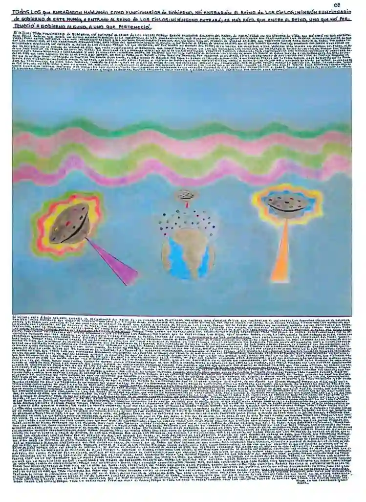 Sí hijito; este dibujo celeste enseña el alejamiento del Reino de los Cielos; los platillos voladores son ángeles de luz que controlan el universo; los pequeños círculos de colores, son las ideas humanas que viajan al cosmos; toda idea que a viajado desde el principio del mundo, a sido recogida por estas naves celestes; igual divino trabajo tienen con los espíritus humanos y de todas las especies de la naturaleza; de verdad os digo, que nadie a entrado al Reino de los Cielos, porque nó se formó un gobierno universal, basado en las escrituras del Padre; la humanidad terrestre así lo prometió al Padre, por sobre todas las cosas; por mucha perfección que haya logrado este mundo, nó entrará al Reino de los Cielos; porque por sobre toda perfección, está la obediencia al Padre; quien nó considera al Padre, nó se considera la gloria para sí mismo; de verdad os digo, que todo Padre y madre al nó preferir al Padre por sobre todas las cosas, dejaron también fuera del Reino de los Cielos, a sus hijos; porque toda carne es hereditaria del conocimiento de sus creadores; toda molécula de carne es influenciada por el espíritu; toda carne es heredera del mismo desarrollo que le dieron los padres; por mucho que se perfeccione los hijos, está siempre sobre ellos, la influencia de sus padres; al pedir todos los espíritus humanos un libre albedrío en este planeta Tierra; pidieron al Padre, tratar de crear el comunismo en sus enseñanzas; esas enseñanzas son las escrituras del Padre Jehova; escrituras y Mandamientos; nadie pidió dividirse ni mucho menos olvidar la promesa común al Padre; he aquí el mundo dividido en uso de su libre albedrío; he aquí la obra de los demonios del libertinaje; porque toda libertad creada de un sistema de vida, que nó tomó en cuenta al Padre, es libertinaje de las criaturas; que habiendo tenido un divino mandato, nó lo cumplieron; de verdad os digo, que ninguno de vuestros paladines que os hablaron de libertad, han entrado al Reino de los Cielos; ni ninguno de sus seguidores; porque la libertad que pregonaron, es libertad con extraña moral; salida de conceptos que violaron la ley del Padre; ninguna libertad se gana, si en nombre de ella, se pisotea los mandatos del Padre; de verdad os digo, que toda guerra y toda matanza que tuvo y tiene este mundo, se paga ojo por ojo, diente por diente, célula por célula, molécula por molécula, cabello por cabello; primero está lo de Dios por sobre todas las cosas; he aquí la caída de los que os hablaron de libertad; la libertad de vuestros antepasados, averguenza al Padre; porque este mundo se dió libertad, sin que sus humildes sean los primeros; de verdad os digo, que todos los que formaron gobiernos conquistada la libertad, ninguno dió primicia al más humilde de los humildes; sabiendo esos ilustrados, que todo humilde es primero, en los divinos mandatos; he aquí un llorar y crujir de dientes; he aquí se cae un vendaje de ceguera; he aquí lo que era verdad y no lo era; he aquí la caída de unos demonios, que pidieron probar sus filosofías de libertad, en un mundo de la luz; he aquí la falsa historia de la Tierra; he aquí quehabéis venerado a los anticristos; a los que mataron y se valieron del nombre del Padre; de verdad os digo, que basta violar una microscópica parte de los mandatos del Padre, y se es un anticristo en el grado que corresponde; he aquí a los demonios de la fuerza; de una violación a la ley del Padre, sacan una causa; causa de muerte en la eternidad; porque el que mata a espada, muere a espada; el que emplea la fuerza, cae por la fuerza; en las futuras exsistencias cuando el espíritu pide pagar las muertes que causó a otros en exsistencias pasadas; cuando pide hacerlo ojo por ojo y diente por diente; de verdad os digo, que por cada víctima, se pagan en trillones de exsistencias fuera del Reino de los Cielos; porque una criatura tiene trillones de células; y ninguna de ellas, es menos delante del Padre; a todas escucha el Padre; porque a todas las creó; ¿nó se os enseñó que todo lo creó Dios? de verdad os digo, que siendo las células microscópicas, ellas son grandes en el Reino de los Cielos; adquieren tamaños colosales; tan inmensos, que sí las viérais, os llenaríais de pavor; y célula por célula, se quejan al Padre cuando han sido asesinadas antes de cumplir su tiempo en la vida; porque todo cuanto exsiste, pidió su tiempo para cumplir sus propias leyes; de verdad os digo, que hasta el tiempo robado a las células, se queja delante del Padre; he aquí el universo viviente del Padre Jehova; he aquí la futura filosofía del universo en este mundo; he aquí un universo que siempre a exsistido; he aquí el fín de vuestro olvido con respecto del lugar, de donde venís; he aquí soy la luz del conocimiento; partiendo desde el punto en que fuísteis creados; porque nó hay conocimiento completo, si no se sabe de donde se salió; he aquí el Alfa y la Omega; el principio y el fín; principio y fín de una forma de vida, que pidió olvido de su lugar de orígen; he aquí el fin del mundo de la prueba; he aquí el llorar y crujir de dientes, de un mundo que siendo probado porque lo pidió, cayó en la prueba elegida; he aquí la tragedia de un mundo que violó la ley; he aquí la sorpresa pedida en el Reino de los Cielos; como la sorpresa que causa un ladrón de noche; he aquí el fín del materialismo explotador; he aquí la caída de satanás; porque nadie querrá trabajarle a los creadores de la explotación; porque más y más, sus seguidores se alejan del Reino de losCielos; instante por instante; he aquí la más grande revolución de este mundo; tan grande será, que cambiará al mundo; nace nuevo mundo; de verdad os digo, que quien fué del mundo, nó entrará al nuevo mundo; ningún mundano entra; de verdad os digo, que ningún conocimiento del materialismo explotador queda